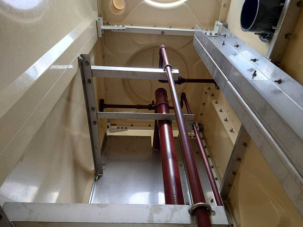 水槽の内部に、配管や水処理装置などの設備機器を取り付け、各種機能を追加します。また配管取出口や通気管などの取り付けも賜ります。